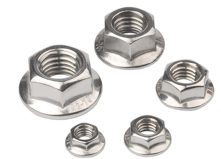 六角法兰螺母主要包括螺母体,螺母体的一端固定有法兰面,螺母体的另一端固定有盖帽。由于帽盖设置在螺母体上,使用六角法兰螺母时具有良好的密封性能,可有效防止雨水、湿气、灰尘等有害物质浸入螺母体,防止螺母腐蚀体,大大延长了六角法兰螺母的使用寿命。主要起到增加与工件接触面的作用。多用于管道、紧固件和一些冲压、铸造零件。